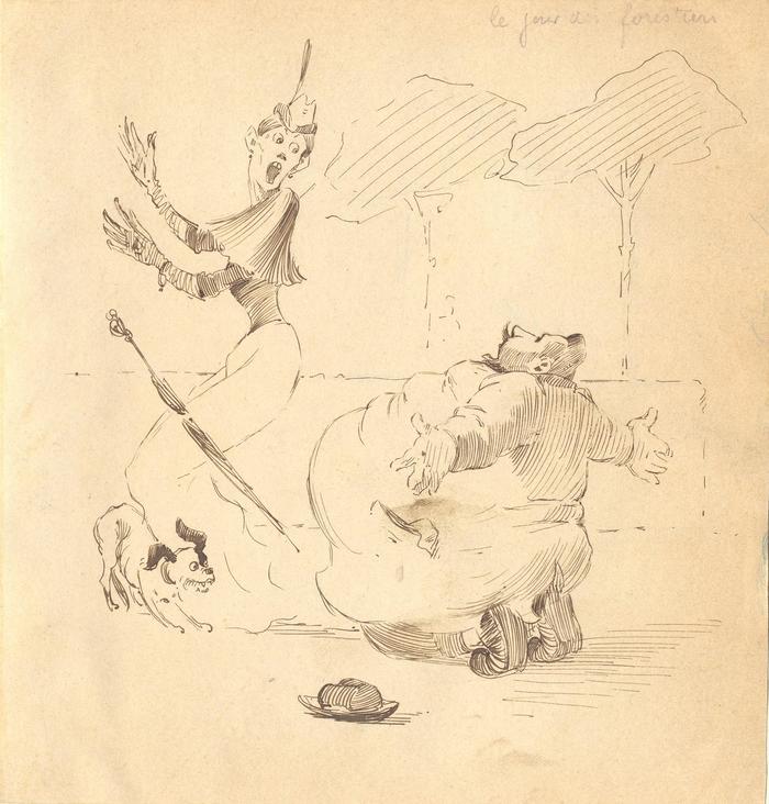 Représentation du pensionnaire René Patouillard de dos, agenouillé devant une femme apeurée qui lache son parapluie et un chien ; près du pensionnaire, son chapeau. A l'arrière plan, une haie et 2 arbres