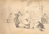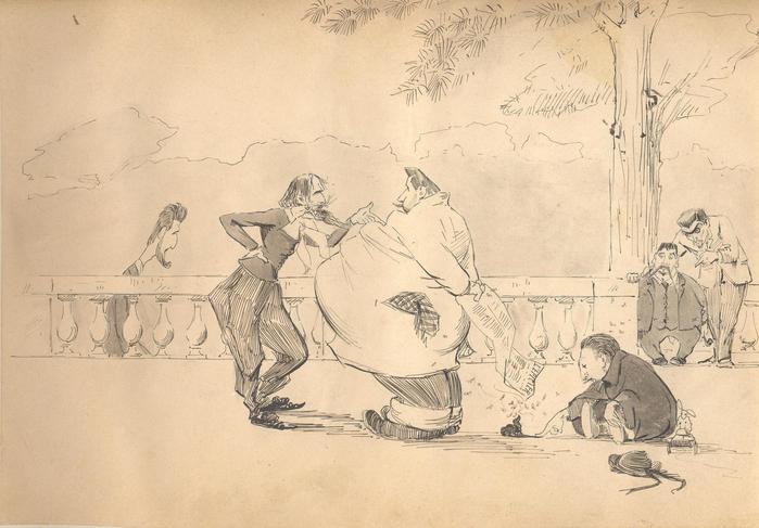 Représentation des pensionnaires (de gauche à droite) Henri Rabaud / Hippolyte Roussel / René Patouillard / Charles Germain / Jérémie Octobre / Jules-Auguste Leroux. sur la terrasse du Bosco ; architecture extérieure avec arbre.