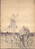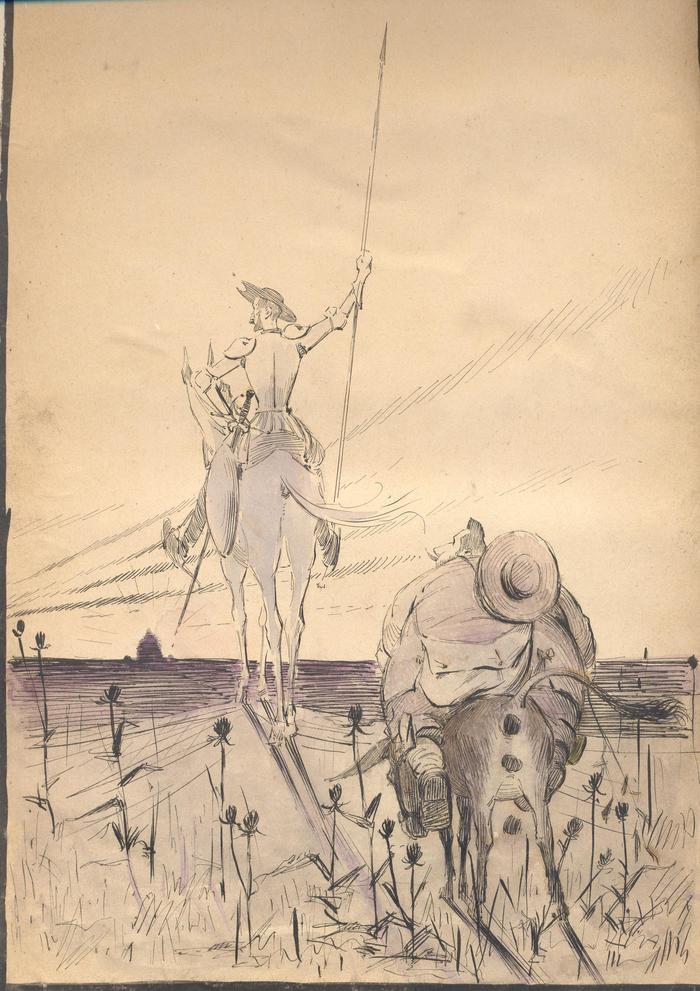 Représentations de dos de Antoine Larée (Don Quichotte) sur un cheval (Rossinante) ; René Patouillard (Sancho Panza) sur un âne.