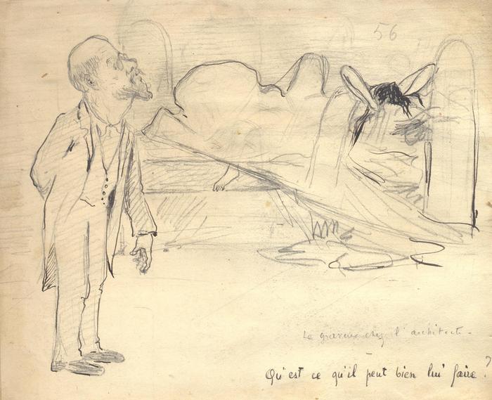 Représentation d’un pensionnaire graveur non identifié [Mayeur ou Quidor] (=F 56r/1) en pied de 3/4 regardant dans une chambre (lit ; couple homme-femme).