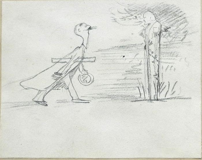 Représentation du pensionnaire Jean Hulot (en marche, en pied, de profil ; tient des instruments d’architecte)