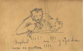 Représentation du pensionnaire sculpteur Henri Bouchard de face en buste attablé (assiette, fourchette).