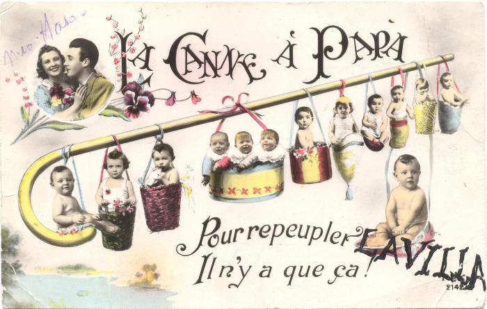 En haut à gauche : médaillon avec un couple homme-femme ; au centre, une canne avec des paniers attachés portant des enfants.